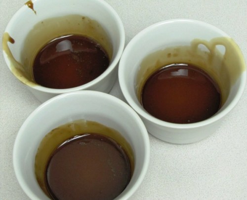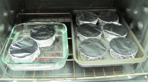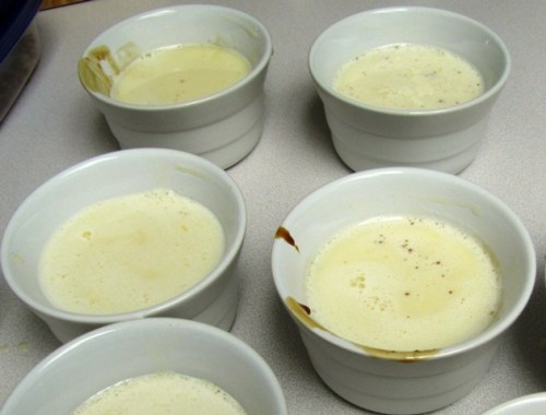 Nota para los que no están en Venezuela: como acá no tengo una quesillera (ese molde maravilloso para quesillo que se consigue en Venezuela hecho de metal, con tapa y todo) simplemente me fui por la opción de hacer varios quesillos individuales usando ‘ramekins‘ o moldecitos de cerámica: preparé el caramelo en una olla y lo distribuí en los moldecitos, luego eche la mezcla, y los cubrí con papel aluminio.
