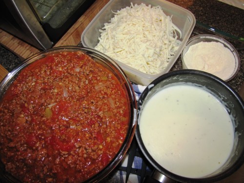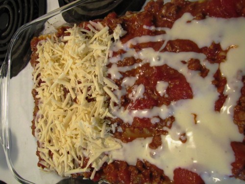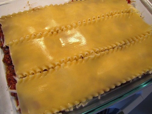 Cocinar la pasta al dente de acuerdo a las instrucciones del paquete. Enmantequillar ligeramente un molde refractario (a mi me gusta usar un pyrex) y colocar una capa de salsa de carne seguida por una capa de pasta: