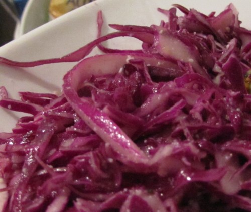 Cortar el repollo morado en juliana o tiritas bien finas, descartando las partes blancas mas gruesas (para cortar el repollo yo utilizo una mandolina). Colocar el repollo en un bol y cubrir con suficiente agua para enjuagar o lavar el repollo. Escurrir bien y colocar en un envase o bandeja para servir. Aparte mezclar el jugo de limón, el aceite de oliva y la sal y emulsionar con un batidor de alambre. Agregar el aderezo al repollo morado, mezclando bien para cubrir todo el repollo. Agregar el queso parmesano y la pimienta negra recién molida, mezclar y servir.