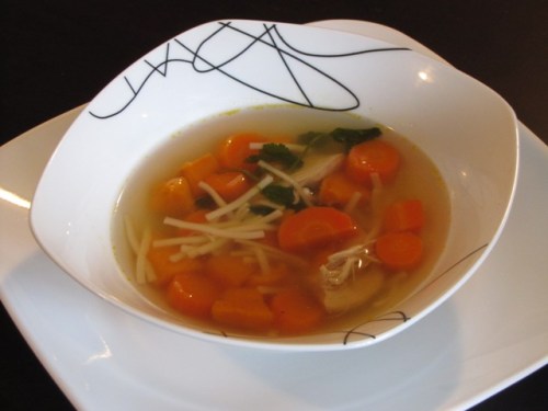 Hoy tengo gripe, que rabia! No me gusta estar enferma, aparte de que obviamente no me gusta sentirme mal, el estar enferma me hace extrañar a mi abuela mas de lo normal. Cuando vivía con mi abuela y me enfermaba, ella estaba siempre ahí para cuidarme, para hacerme té de tilo y una sopita de pollo que tenia propiedades mágicas: podía curarlo todo y a todos… Hoy he decidido levantarme de la cama para prepararme una sopa de pollo con fideos y recordar así a mi abuela Pancha y todo su amor y sus cuidados… listo, ya solo con eso basta para sentirme mejor! Como muchas de mis recetas, esta es un poco al «ojo por ciento». Aca les indico varios ingredientes, pero atrévanse a prepararla con lo que tengan en la casa.