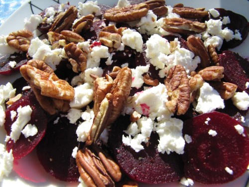 Esta ensalada me gusta porque es muy fácil de preparar y porque me encanta la combinación del sabor dulce de las remolachas con lo salado del queso y con la textura crujiente las nueces. Ademas me hace recordar una conversación con mis amigas mexicanas, que se preguntaban que carrizo es una remolacha!? Porque resulta que en México la remolacha se llama betabel. Siempre me maravilla ver que, aunque hablamos el mismo idioma, la variedad entre las culturas de los diferentes paises latinoamericanos es tanta que a menudo nos brinda la oportunidad de aprender algo nuevo. Solo una advertencia: esta es una de esas recetas «al ojo porciento», simplemente la preparo con lo que tengo a la mano, así que las cantidades, se las debo 😉