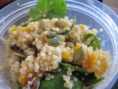 Colocar la quinoa en un colador y lavar (colocándola bajo un chorro de agua) por unos minutos, escurrir bien y colocar en una olla junto con 1 taza y media de agua. Llevar a un hervor, tapar y bajar la temperatura al mínimo, dejándola cocinar por 15 a 20 minutos. Una vez cocida colocar en un bol grande. Mientras se cocina la quinoa, colocar los cuadritos de auyama o calabaza en una sarten grande con suficiente agua para cubrir los trocitos a la mitad. Colocar a fuego medio-alto y cocinar por 3 a 5 minutos removiendo de vez en cuando, hasta que la auyama se comience a ablandar (es importante no dejarla ablandar mucho o terminaran con un puré). Escurrir la auyama y aderezar con sal y pimienta al gusto. Agregar la auyama cocida, las espinacas y las pasas al bol con la quinoa cocida y mezclar para incorporar todos los ingredientes. Al momento de servir agregar el aderezo de sirop de maple y mezclar, y finalmente colocar las pepitas o semillas de calabaza por encima.