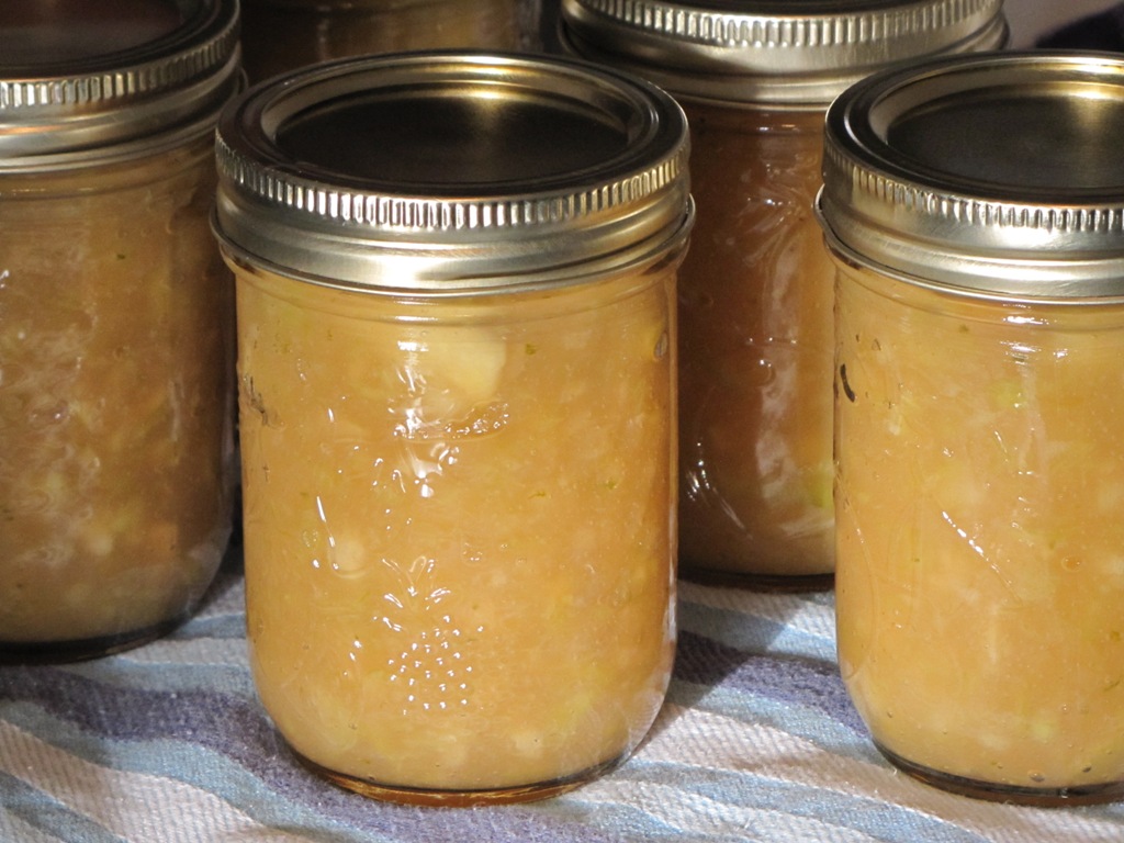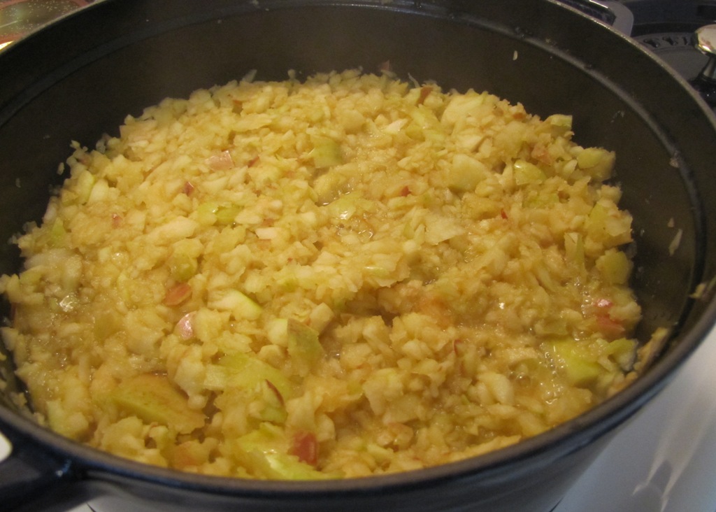 Esta es una receta del blog Local Kitchen que encontré buscando ideas para usar la caja de manzanas que me regalaron hace poco. Le hice un pequeño ajuste a la receta original, y quedo bastante buena. De hecho, lleve una jarrita de esta mermelada a casa de unos amigos la semana pasada para desayunar juntos. Mis amigos inmediatamente abrieron la mermelada, se la untaron a unas panquecas y dieron su veredicto: deliciosa. Misión cumplida! 😉 Estas cantidades rinden para llenar 5 jarritas de 250 ml. dejando incluso un poquito extra para probarla recién hecha.