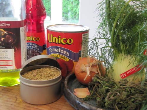 Calentar el aceite en una olla a fuego mediano, agregar la cebolla y el hinojo y cocinar removiendo de vez en cuando por 5 minutos. Agregar el ajo y cocinar por otros 5 minutos aproximadamente, removiendo a menudo pues el ajo tiende a quemarse. Agregar el tomillo y las semillas de hinojo, remover y cocinar por unos 2 minutos mas. Escurrir el liquido de la lata de tomate en la olla y remover para combinar con los demás ingredientes, estripar los tomates con las manos y agregar a la olla también. Llenar la lata de tomates con agua como hasta la mitad, y agregar a la olla. Remover, llevar a un hervor, y luego bajar la temperatura y cocinar a fuego lento, destapado, por aproximadamente 45 minutos a 1 hora. Agregar una pizca de sal, una pizca o dos de azúcar y unas gotas de vinagre de vino tinto, agregar mas o menos de estos tres ingredientes según el gusto. Se puede servir espolvoreada con queso parmesano rallado, con trocitos de queso de cabra por encima, o acompañada con rebanadas de pan rustico o con trozos de tortillas de maíz tostadas.